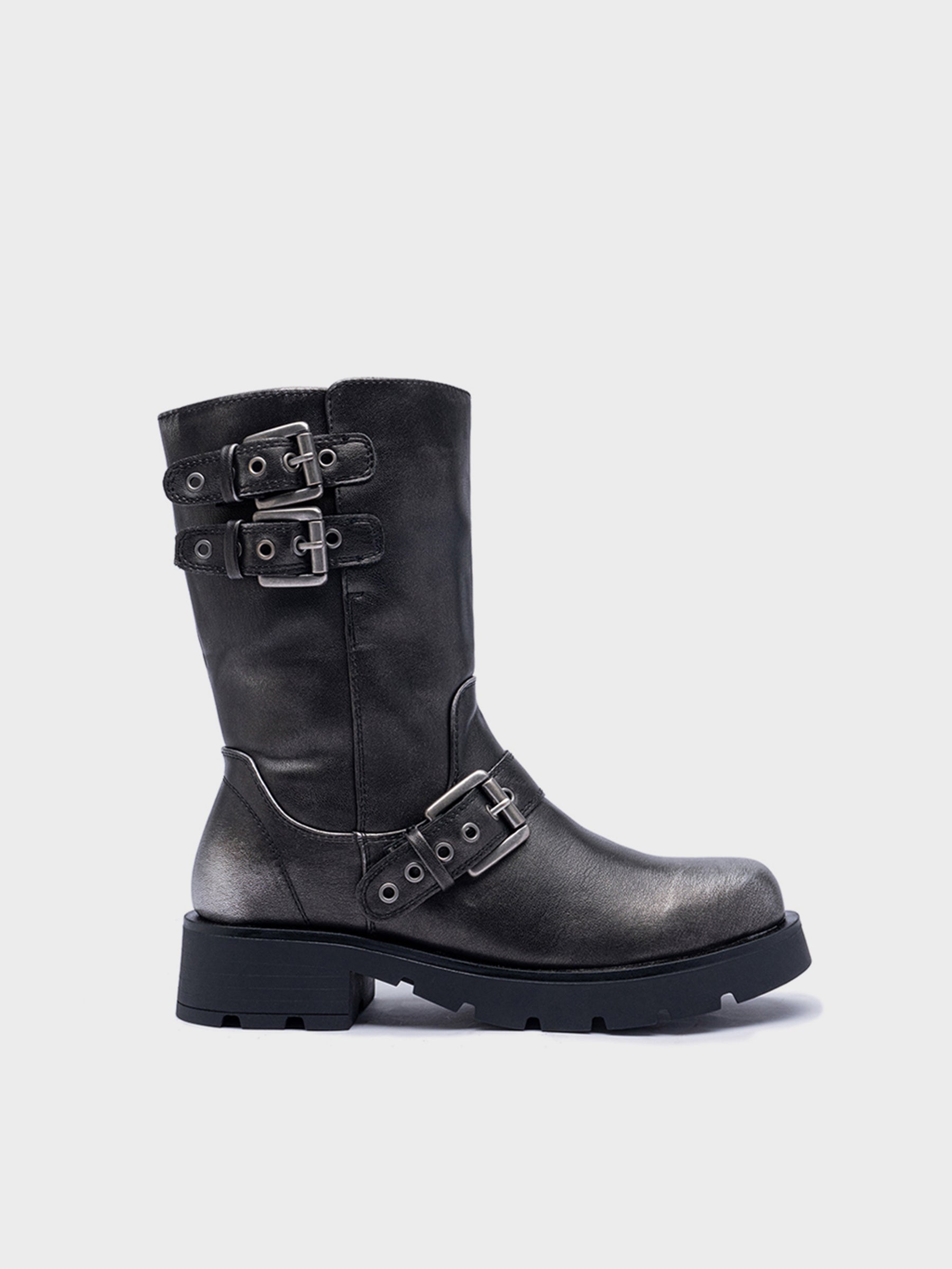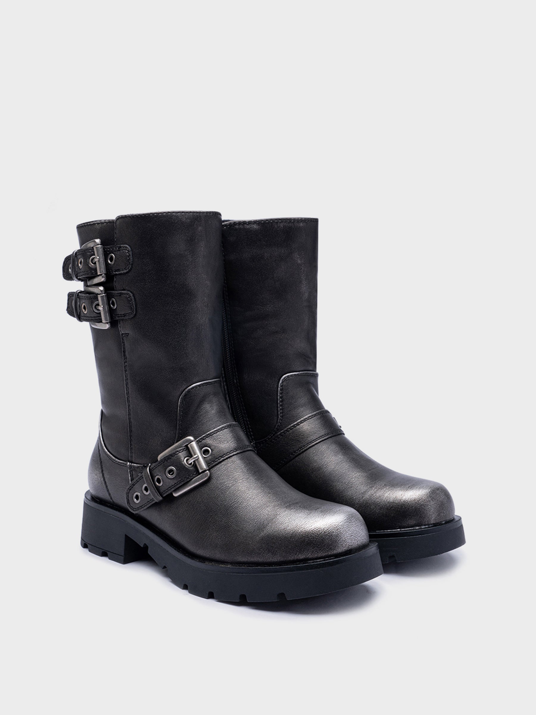 Bota estilo biker en piel sintética. Detalle de hebillas metálicas ajustables en el lateral. Suela track voluminosa con acabado dentado. Cierre mediante cremallera en el interior.
