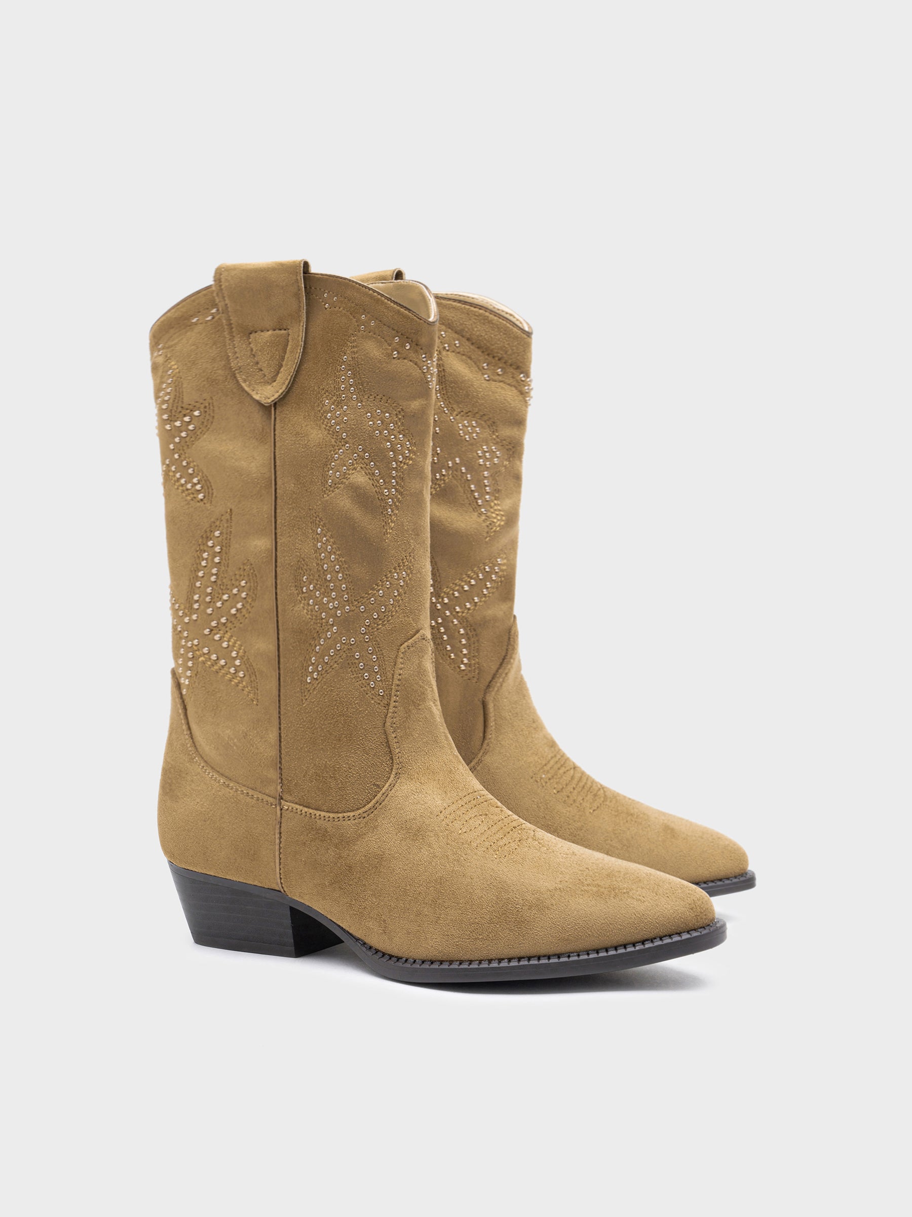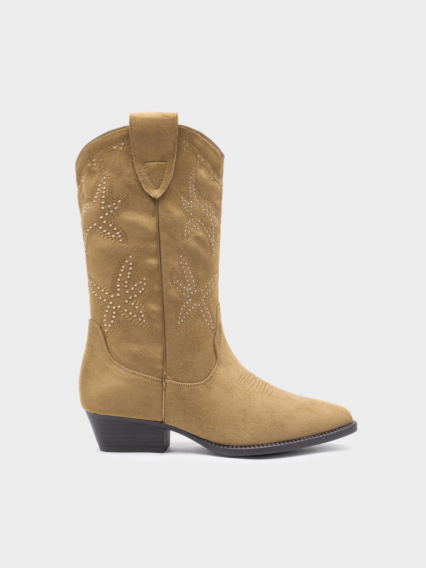 Bota de media caña estilo western en serraje suave. Detalle de bordados decorativos con tachuelas metálicas en el caño. Punta afilada, cremallera interior para facilitar el calce y tacón bajo ancho.