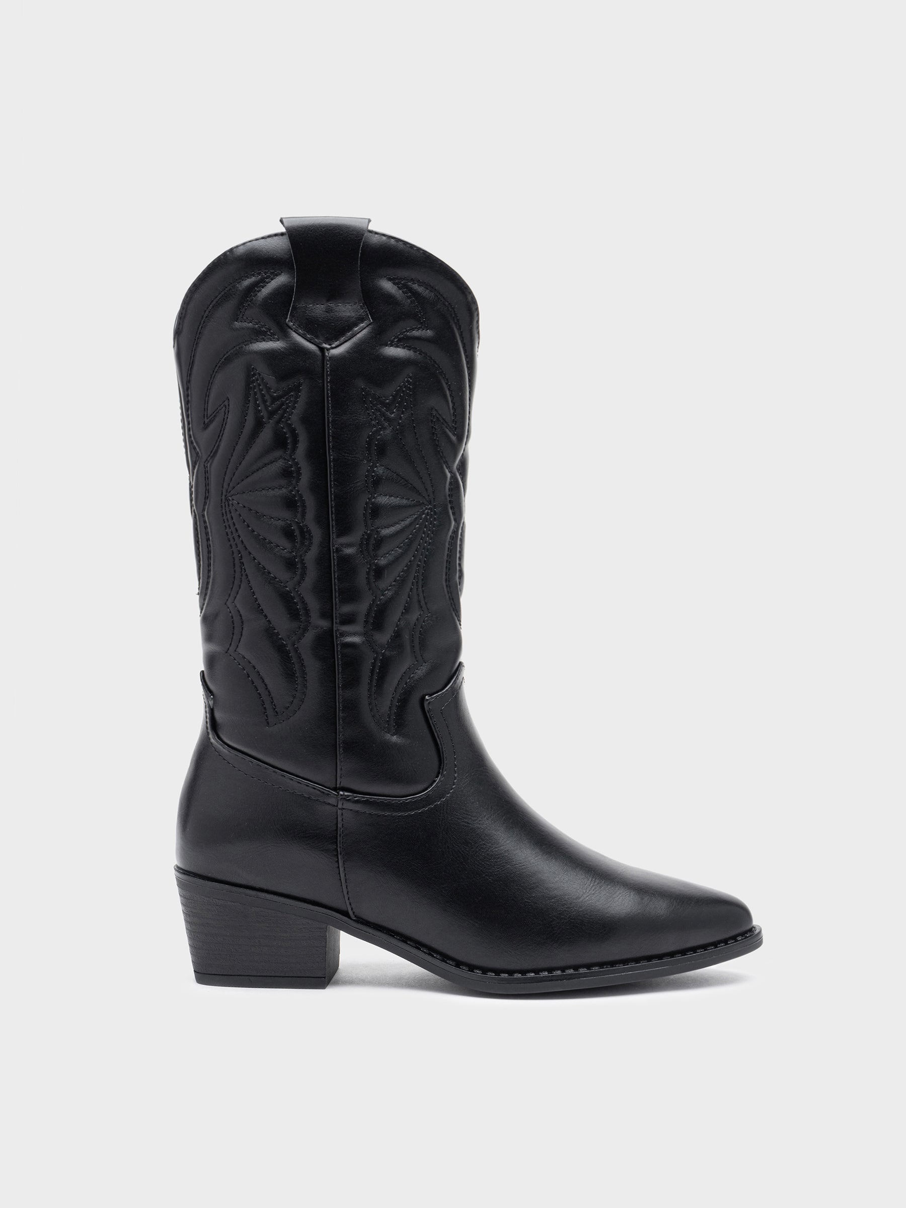 Bota de media caña en material efecto piel con bordados estilo western. Punta afilada, cremallera interior para mayor comodidad y tacón bajo ancho.
